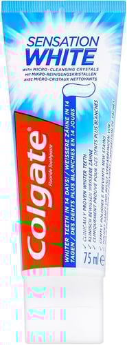 Colgate Sensation White Tannkrem inneholder mikrokrystaller som holder munnen ren og sunn.