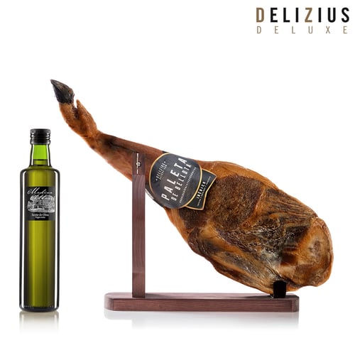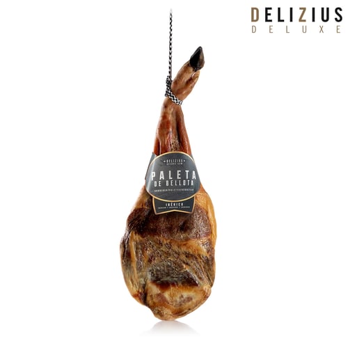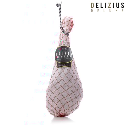 • De mest krevende ganene vil finne uendelig glede i Delizius Deluxe eikenøttfôret Ibericoskulder (50% Ibericorase)! Den eikenøttfôrede Ibericoskulderen er resultatet av en skinke som produserer tradisjon og kultur for en befolkning som har blitt opprettholdt gjennom århundrer, og opplevelsen har blitt gitt videre gjennom påfølgende generasjoner. Den har stor internasjonal prestisje og blir verdsatt over hele verden som et gourmet- og delikatesseprodukt. Jabugo er en lokalitet i provinsen Huelva (Spania), der både det naturlige miljøet og det spesielle klimaet favoriserer herding av Ibericoskuldre og skinker og frittgående oppdrett av Ibericoraser, som hovedsakelig er oppdrettet på eikenøtter. Det eldgamle ritualet og århundrer gamle tradisjonen for å produsere eikenøttfôrede Ibericoskuldre og skinker utgjør et ekstra element i differensiering fra de andre skinkene på markedet. Herdetid: ca. mellom 36 og 48 måneder. Lite salt.